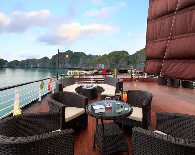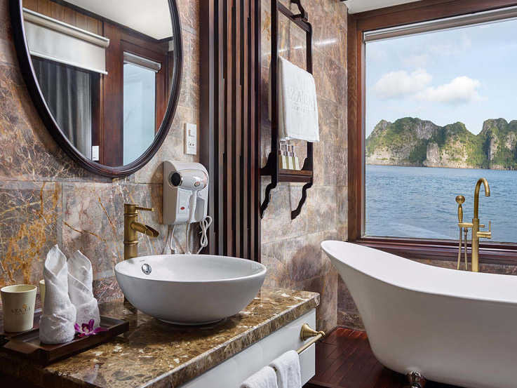 This corner suite offers a sweeping view of Lan Ha Bay from its wide windows and balcony. With a spacious sitting area and elegant design, it’s perfect for couples seeking comfort and privacy.