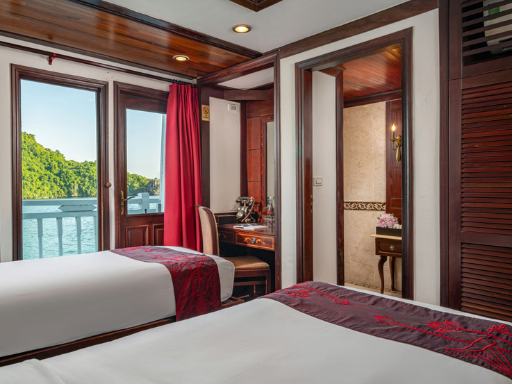 The most luxurious cabin on board, the President Suite features a king-size bed, a full-size bathtub, and beautifully detailed interiors. Ideal for guests who want extra comfort and style during their cruise.