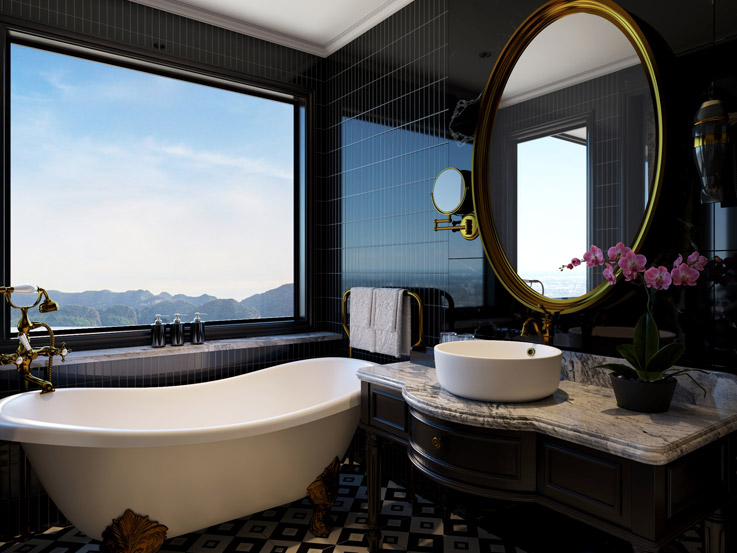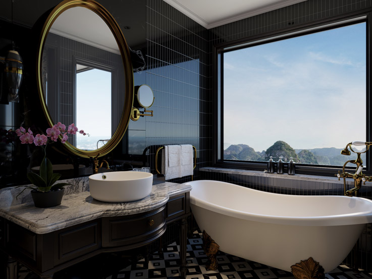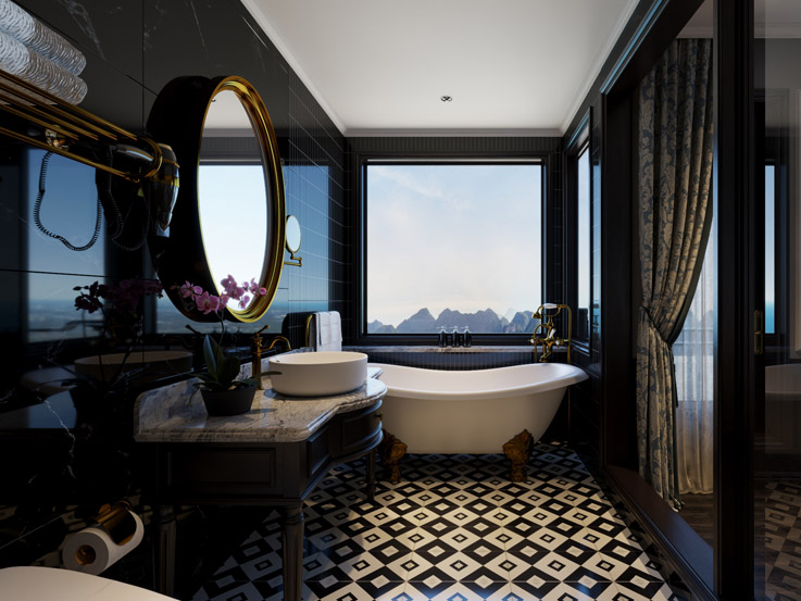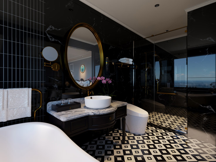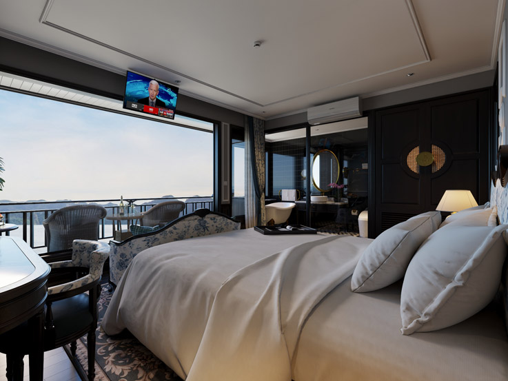 This spacious suite offers stunning wraparound views through floor-to-ceiling windows and a large private terrace. It’s a luxurious retreat designed for uninterrupted relaxation and sweeping bay scenery.