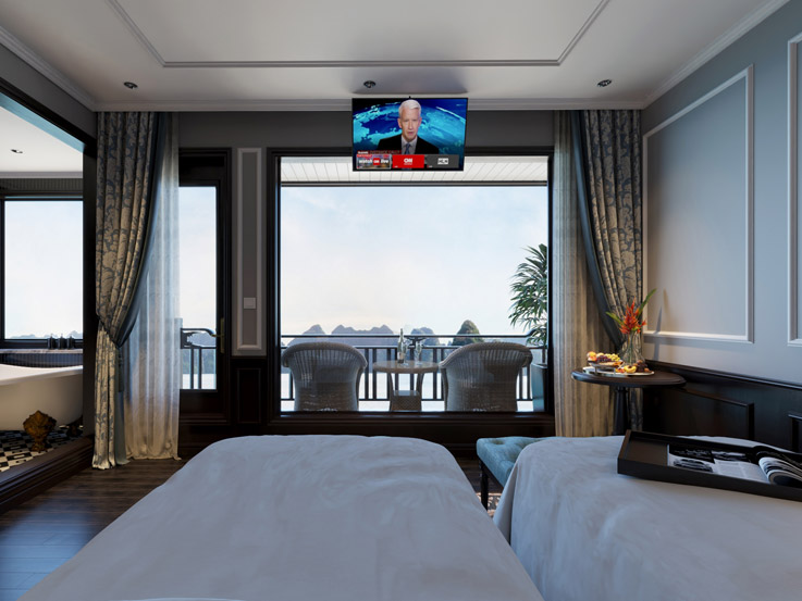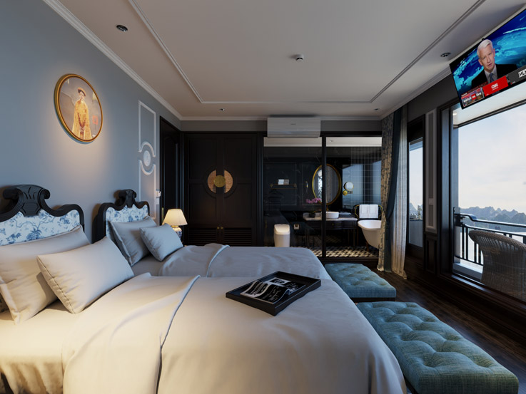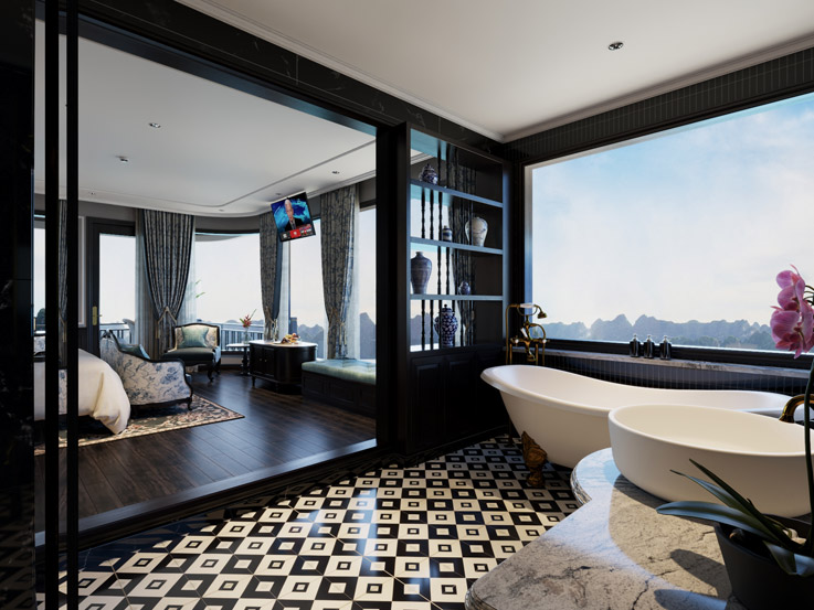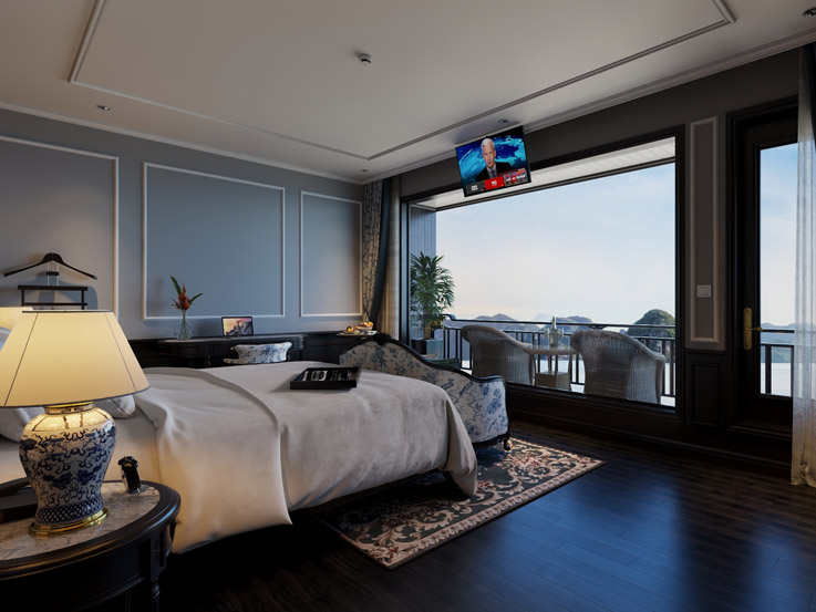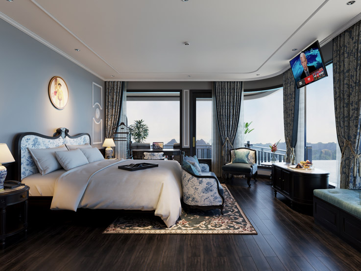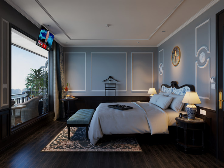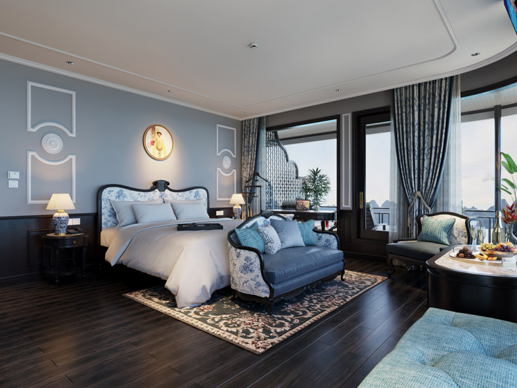 The Grand Suite offers classic elegance and comfort with stylish furnishings and large windows. A great choice for couples traveling with a child, combining privacy and beautiful bay views.