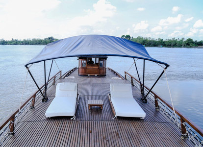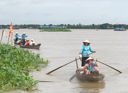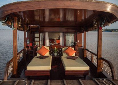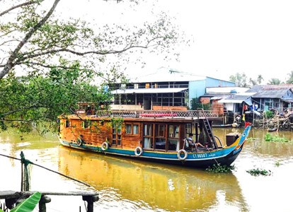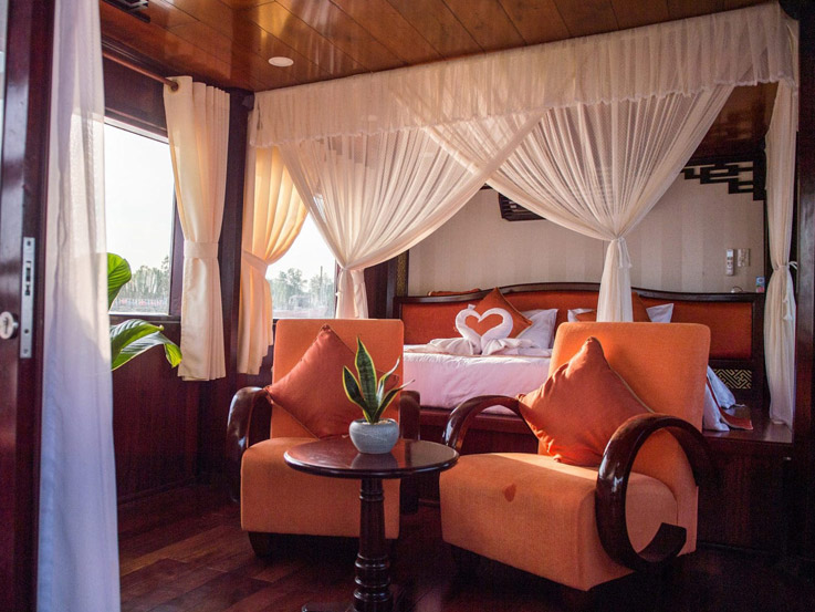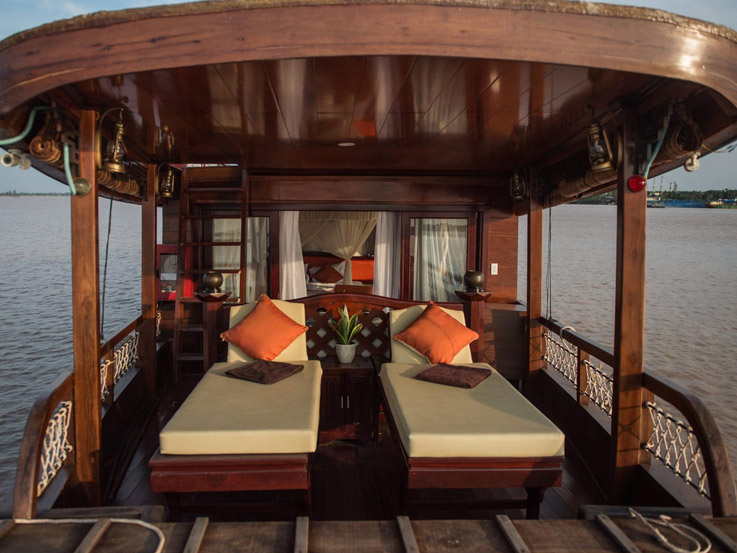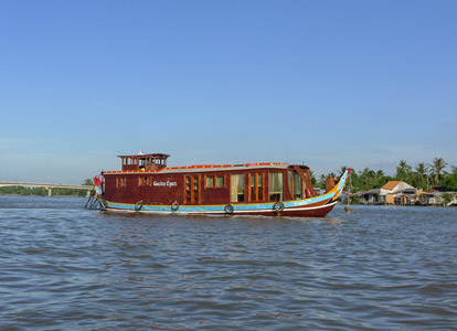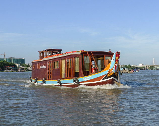 At around noon, guests board a wooden boat cruise. After enjoying a welcome drink, the crew will introduce the facilities on board and help guests check into their cozy cabins. Once lunch is served, the boat departs, and guests have the opportunity to admire the beautiful scenery and daily life of the people of the Mekong Delta.