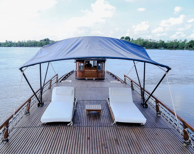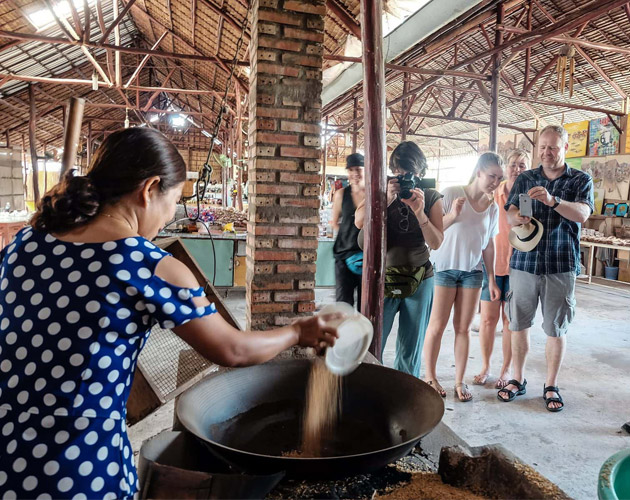 In the afternoon, guests disembark for a guided tour of Xeo Quyt – a forest in Dong Thap province that was once a command post during the war. The area has now been transformed into an open-air museum and park, and guests can explore the command center, caves, and hideouts via sampan boat trips or on foot.