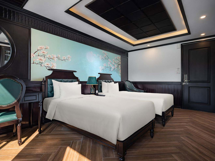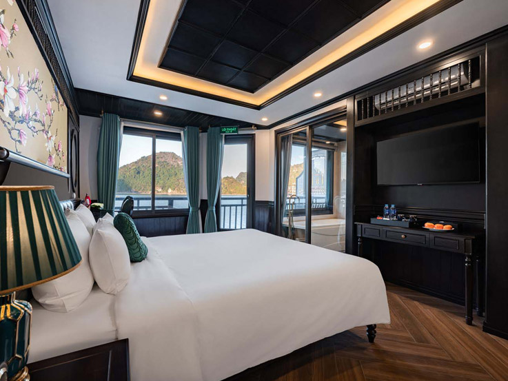 The Senior Suite Balcony offers extra space and a higher deck location, bringing in natural light through floor-to-ceiling windows. A private balcony lets guests fully appreciate the breathtaking beauty of Lan Ha Bay Cruises, while the elegant interior creates a peaceful and refined atmosphere.