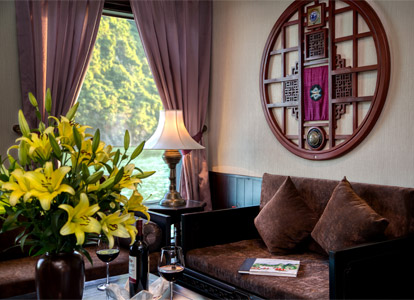 Right at the front of the upper deck of Heritage Line Violet Cruise, the premium front-facing Dragon and Phoenix Suites give you the best views of the bay. These rooms have a warm, reddish color theme mixed with touches of gold and silver in the design. They feature large glass doors, private balconies, and a style inspired by the elegant 1930s Art Deco era, reminiscent of the charm and style of old French Indochina.