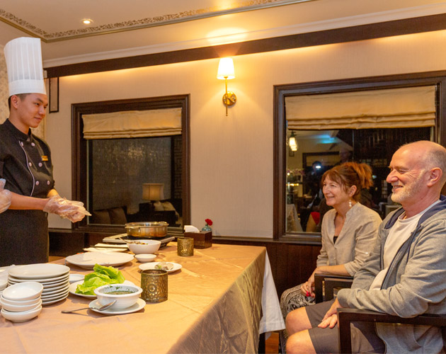 Perched on the upper deck of Heritage Line Violet Cruise, the two Imperial Suites—one with a twin bed and the other with a double—are called Moon and Cloud, each featuring a unique interior that matches their mystical names. The Cloud and Moon suites are painted in soft, dreamy white or gentle sky-blue tones, creating a relaxing vibe. They both have wide glass doors that open to private balconies, offering lovely views. The interiors display an elegant style from the 1930s, inspired by French Indochina’s art deco design, giving it a charming, vintage feel.