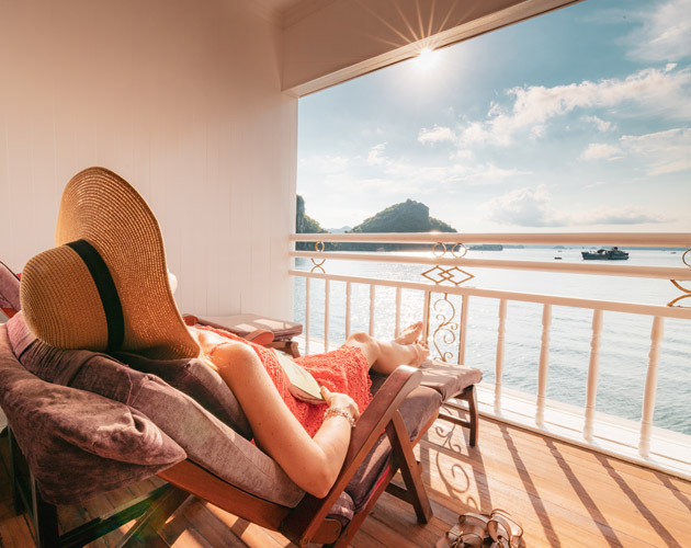 Violet's Junior Suites, Water & Mountain (double and twin), inspired by elements of Halong Bay, are positioned at the front of the main deck of Heritage Line Violet Cruise with their private balconies facing the direction the cruise is moving. The Water Suite features a soft, maritime-themed interior with artwork that creates an ocean-like vibe, while the Mountain Suite is decorated in warm yellow tones with wood carvings, reminiscent of the limestone cliffs outside. The bathrooms are equipped with Italian marble, featuring spacious walk-in showers and relaxing Jacuzzis.